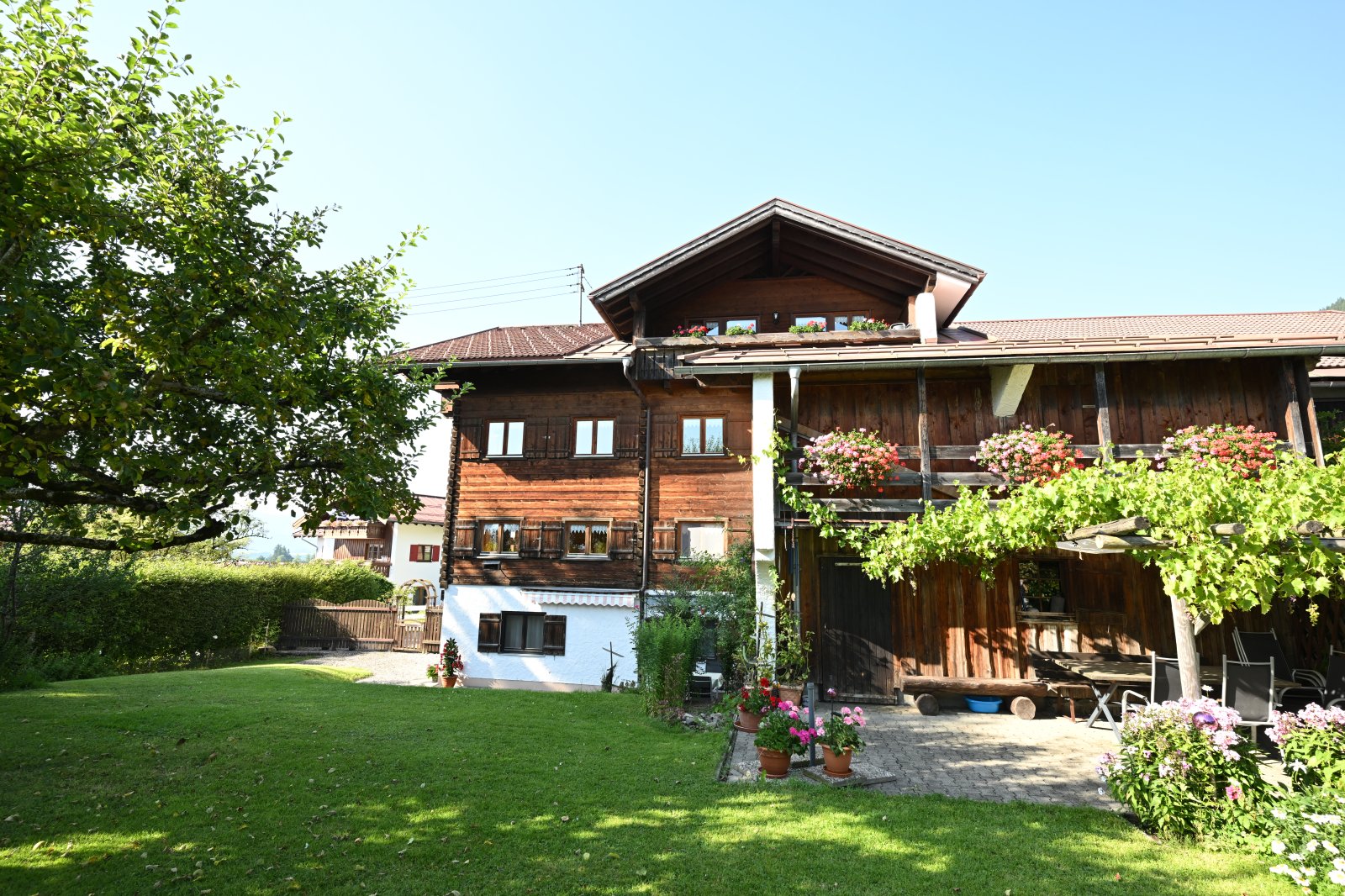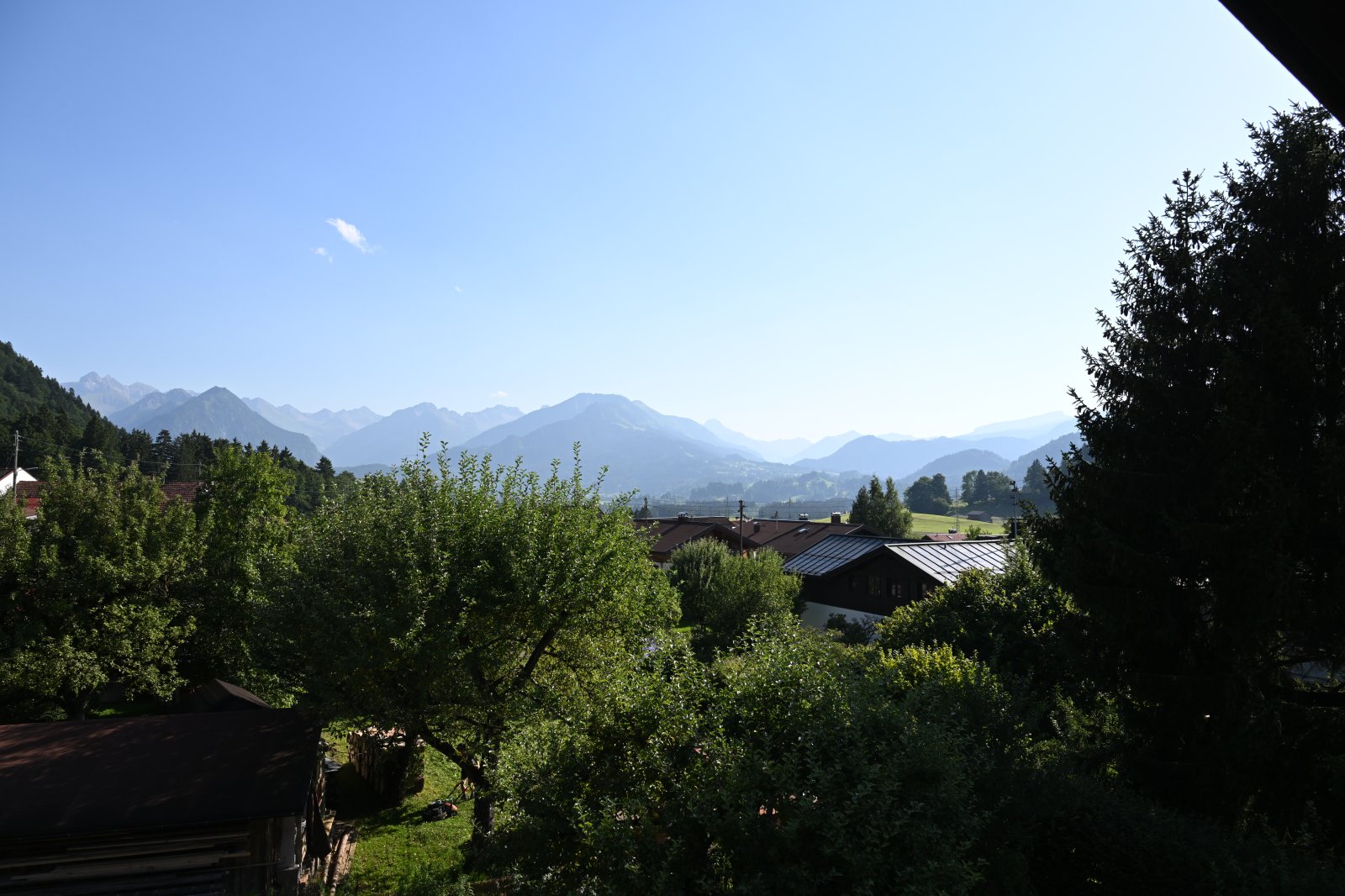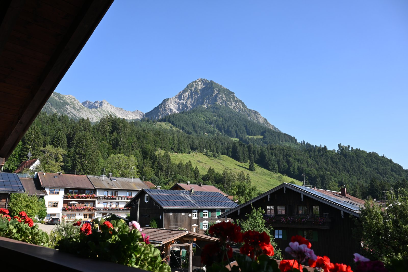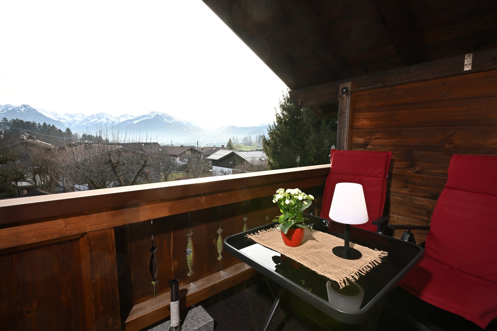 Der großräumige, überdachte Balkon (6,5 m) gewährt einen atemberaubenden Blick auf die Allgäuer Alpen.